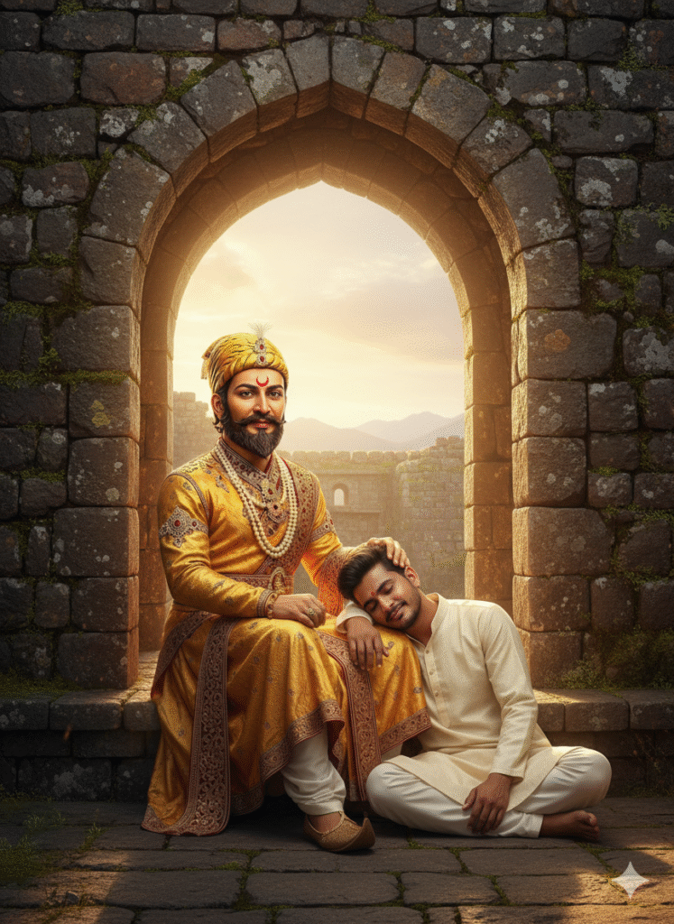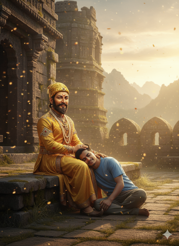 Next to him, the person (from second reference) sits cross-legged on the fort’s original stone floor, head gently resting on Shivaji Maharaj’s lap, eyes closed in peaceful devotion.