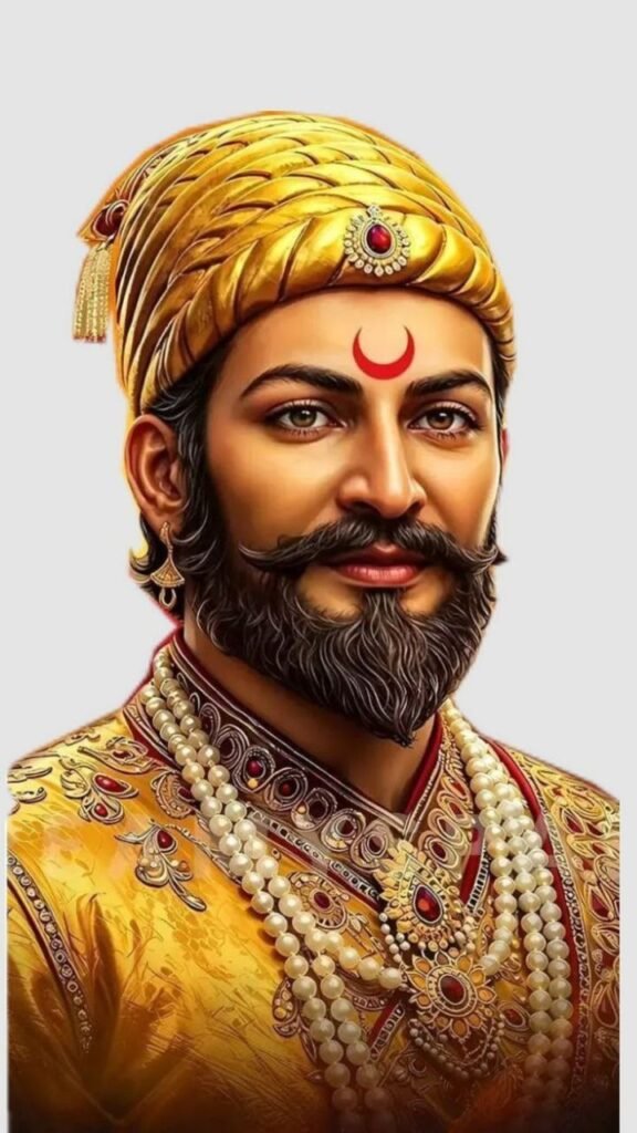 Ultra-realistic, high-resolution digital art of Shri Chhatrapati Shivaji Maharaj (historically accurate facial likeness, golden royal attire, pearl necklaces, traditional turban with ornaments, and regal jewelry).