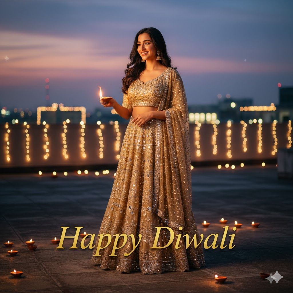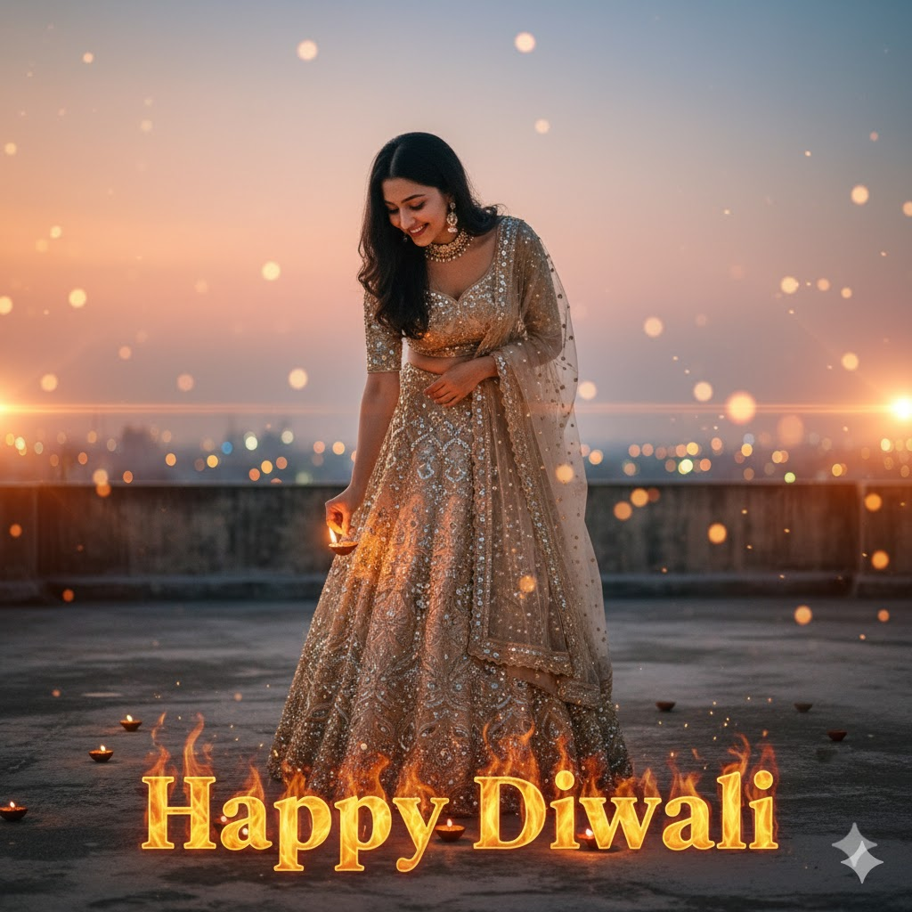 4k cinematic picture of a young Indian woman, standing atop a rooftop at the transition from day to night. She is posing fashionably while sporting a lovely smile and wearing a golden and silver lehenga. She is illuminating rooftop diyas. The background features a creamy and gentle bokeh effect of light lamps and flare lights, rich in dramatic and cinematic elements.