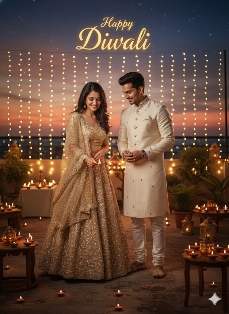 4K ultra-cinematic portrait of a young Indian couple standing together on a rooftop at the magical transition from day to night. The woman, dressed in a shimmering gold and silver lehenga, smiles gracefully as she lights rooftop diyas. The man stands beside her, admiringly dressed in an elegant traditional sherwani, both glowing in the warm flicker of diya lights. The rooftop is beautifully decorated with diyas and festive lanterns, with a creamy bokeh background of lamps and flare lights, adding a rich, dramatic, and cinematic atmosphere. Soft golden lighting highlights their faces, giving a dreamy festive vibe.