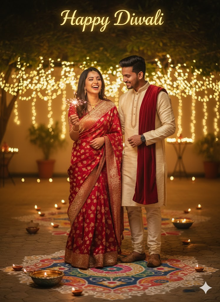 4K cinematic image of a young Indian couple celebrating Diwali in an open courtyard beautifully decorated with rangoli, fairy lights, and floating diyas. The woman, dressed in a royal red and gold saree, holds a sparkling phuljhadi (sparkler) in her hand, her laughter glowing in the soft golden light. The man, wearing a cream-colored kurta with a velvet stole, gently watches her with a warm smile. Around them, strings of fairy lights hang from trees, and soft bokeh glows fill the background. The scene captures a romantic festive evening full of color, light, and warmth — blending tradition with cinematic drama.