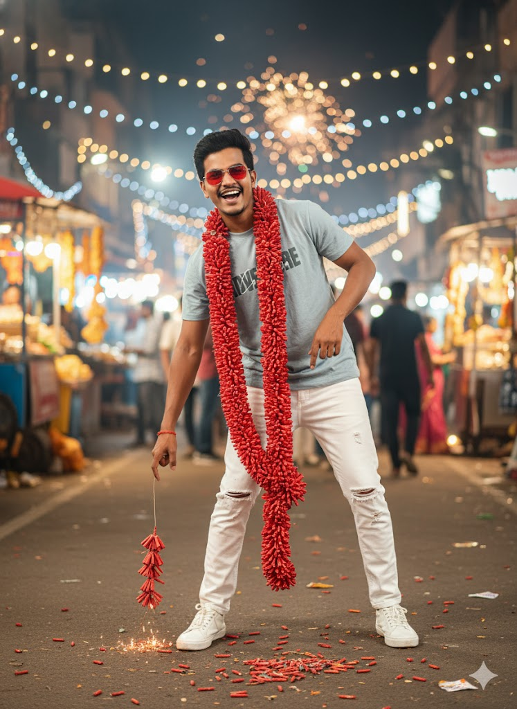 A stylish young man, face in realistic (a face reference) celebration with diwali in street background, my hand in 10000 wala red Garland crackers in the rode. Grey popcorn shirt white iean and white shoe, red frame sunglasses. Standing stylish funny pose, Captured in ultra-detailed 8K resolution with sharp textures natural skin tones. realistic shadows, and a premium fashion editorial aesthetic.