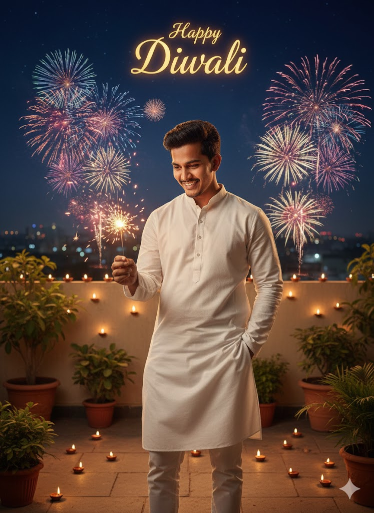 Ultra realistic 4K cinematic portrait of the same young man, face exactly like the reference photo. He is standing on a terrace at Diwali night, wearing a white kurta. One hand holds a lit phooljhadi and he looks at it happily, the other hand in pajama pocket. Background shows night sky with fireworks and a terrace wall decorated with glowing diyas. Natural, festive, and highly realistic. And add a gold text in background Happy diwali