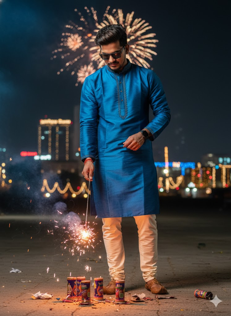 A Full-body, ultra-realistic 8K cinematic portrait of a handsome young man, 28 year old (face perfectly matching the uploaded reference image), wel groomed beard and stylish dark and slightly brown hair, He is wearing traditional kurta and pajama, sleek black sunglasses and a stylish black smartwatch He is lighting vibrant Diwali fireworks (patakhe) sparks flying dynamically in slow-motion around him