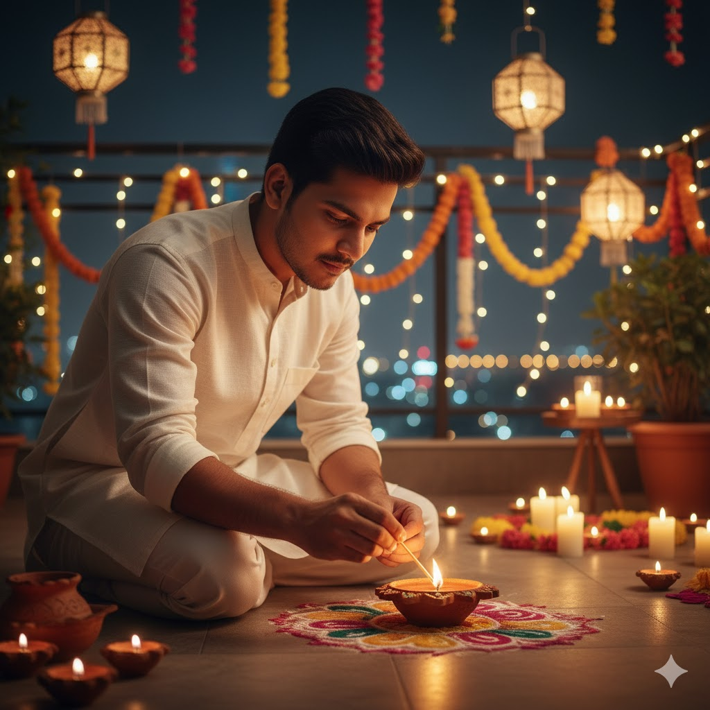 Ultra realistic 4K HD Diwali festival scene. a handsome vouna man wearina a stvlish traditional lilen shirt, gracefully lighting an earthen diya lamp. His face must remain exactly the same as in the reference photo, no face change. Background is outdoor with a modern festive look - balcony or terrace decorated with fairy lights, lanterns, glowing candles, flower garlands, and elegant rangoli Warm golden cinematic lighting, natural skin tone, high quality