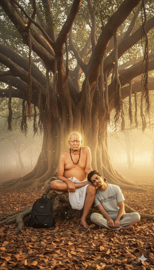 In the center, Shri Swami Samarth is sitting calmly on a natural elevated root-throne of the banyan tree. He has a divine aura, bald head, tilak on forehead, wearing his original traditional attire exactly as shown in the reference photo, along with his natural ornaments and garlands. A black backpack is placed beside him on the ground in the foreground. Behind Swami Samarth, sunlight forms a subtle halo around his head, enhancing his divine presence.