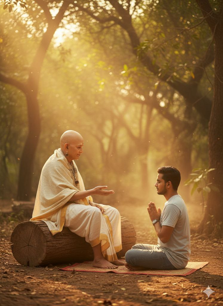 A cinematic, emotional frame featuring the two attached persons together in a Vrindavan aashram, with soft golden evening light filtering through the foliage. Both subjects are seated by a large log – the elder person sits gracefully upright on the log, appearing calm and wise as they gently speak and share wisdom. The younger person is seated on the ground in front, praying with devotion. The elder person blesses her with his hand as they face each other, creating a serene and divine atmosphere. Do not change the faces from the referenced images.